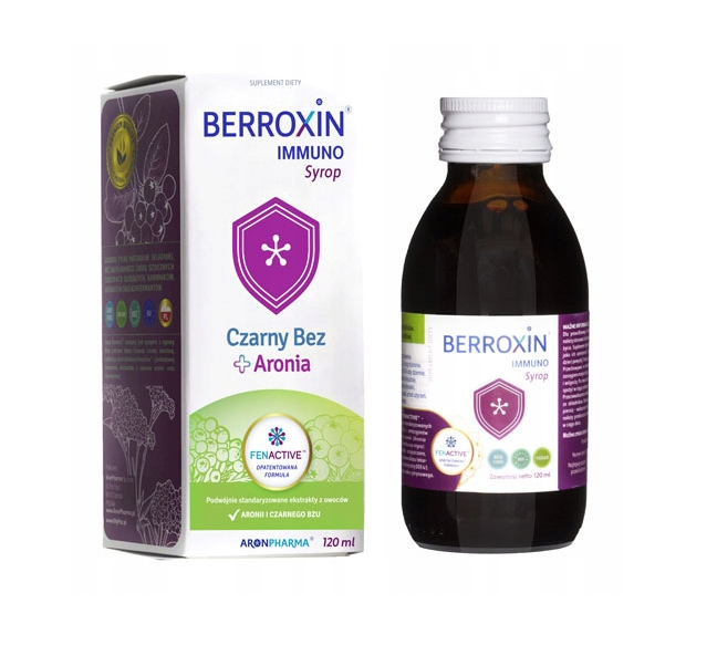 Syrop Berroxin™ Immuno słodzony jest syropem z agawy, który pokrywa błonę śluzową cienką warstwą, nawilżając gardło Fenactive™ – unikatową kompozycją podwójnie standaryzowanych ekstraktów z owoców aronii (Aronia melanocarpa) i czarnego bzu (Sambucus nigra).